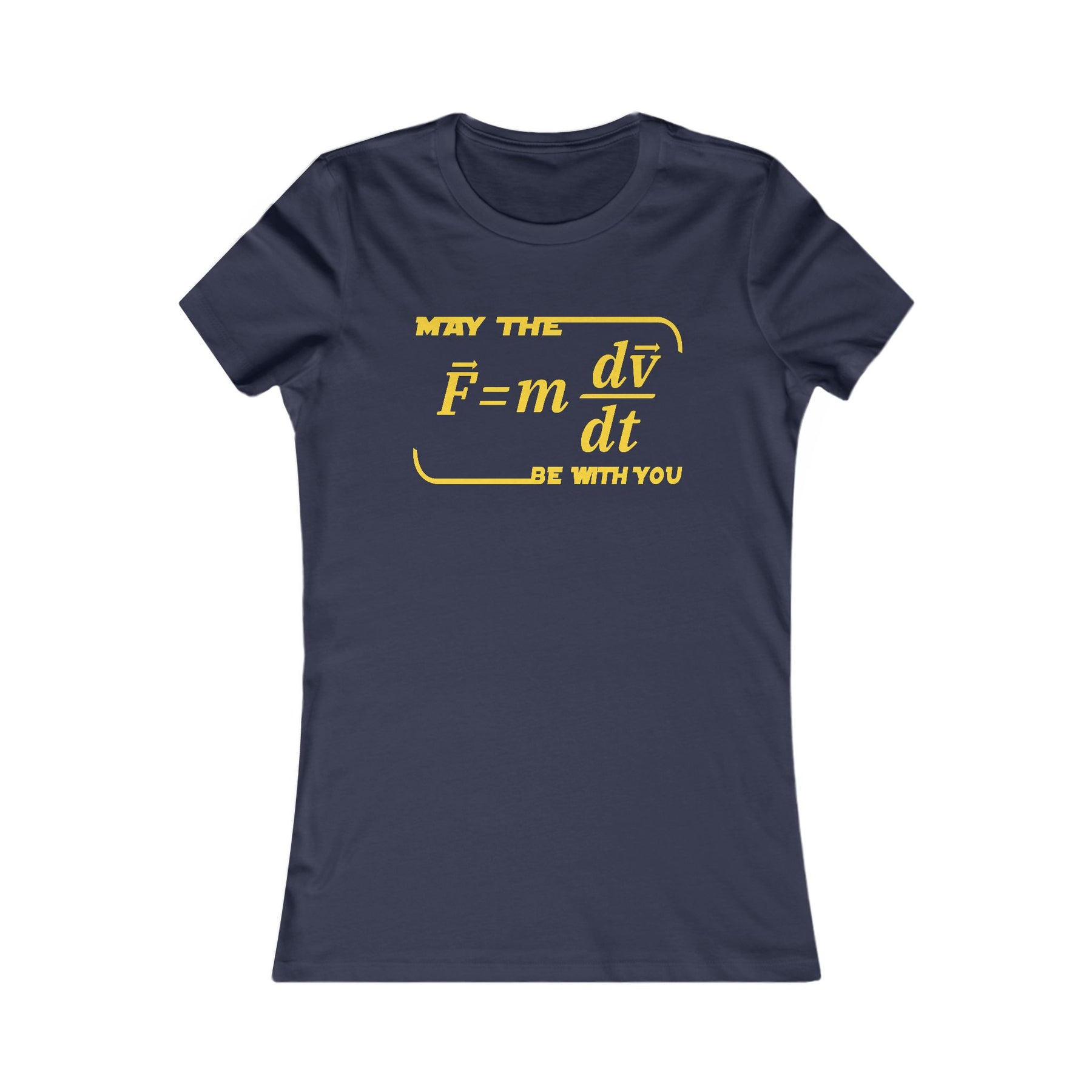 Light, soft, and smart — this slim-fit tee mixes a love of physics with playful fandom. The front graphic reads like a clever mash-up of Newton’s second law and a well-known sci-fi blessing, rendered in warm gold against a deep background. It sits close to the body with a slightly longer length, so it layers cleanly under jackets or wears on its own for study nights, lab demos, or cons. The fabric drapes gently and feels breathable; the ribbed collar and shoulder tape keep the silhouette tidy through repeated wear.